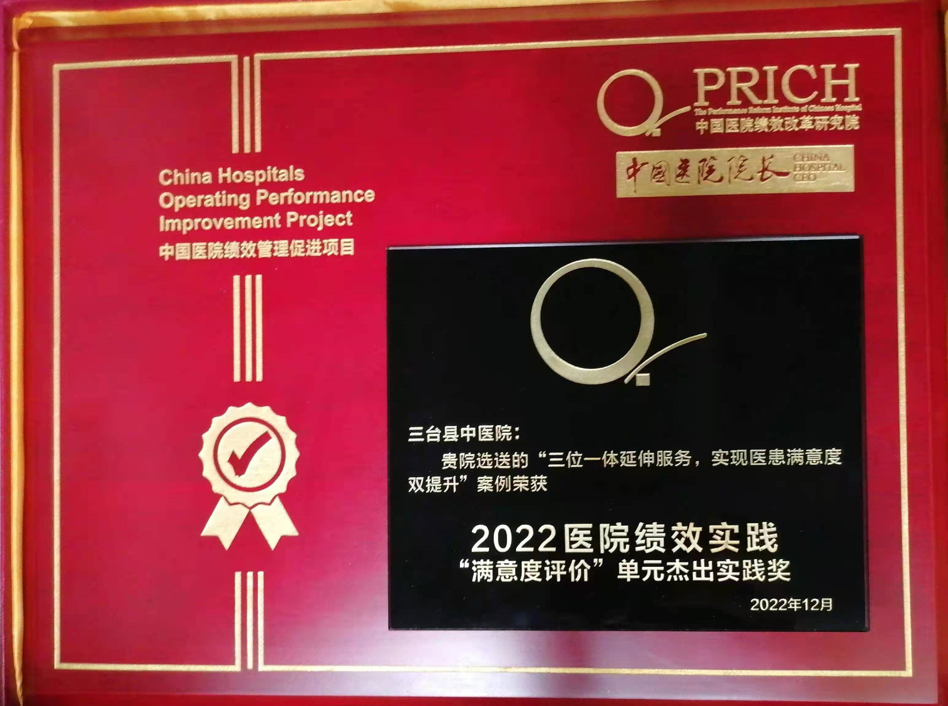 大会对第三届全国医院绩效标杆案例获奖单位进行了颁奖,三台县中医院“三位一体延伸服务,实现医患满意度双提升”,斩获“满意度评价”单元“杰出实践奖”。同时,院长卢文华荣获2022年度第二届“市县医院杰出管理人物奖”。