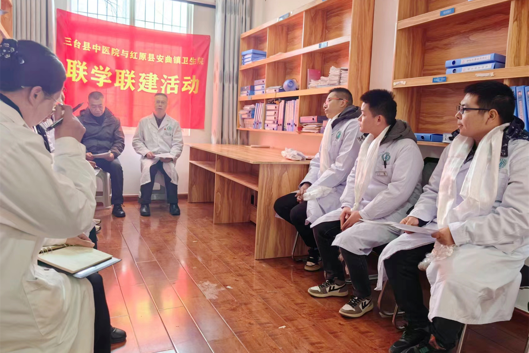 在安曲镇卫生院,副院长杜胜勇组织对口支援专家团队与安曲镇卫生院党支部开展支部共建活动,以《坚持健康优先 建设健康中国》为题为在场人员讲了一堂主题党课。随后双方就安曲镇卫生院今后工作重点、人才培育、学科建设、技术服务等方面进行了深入探讨。