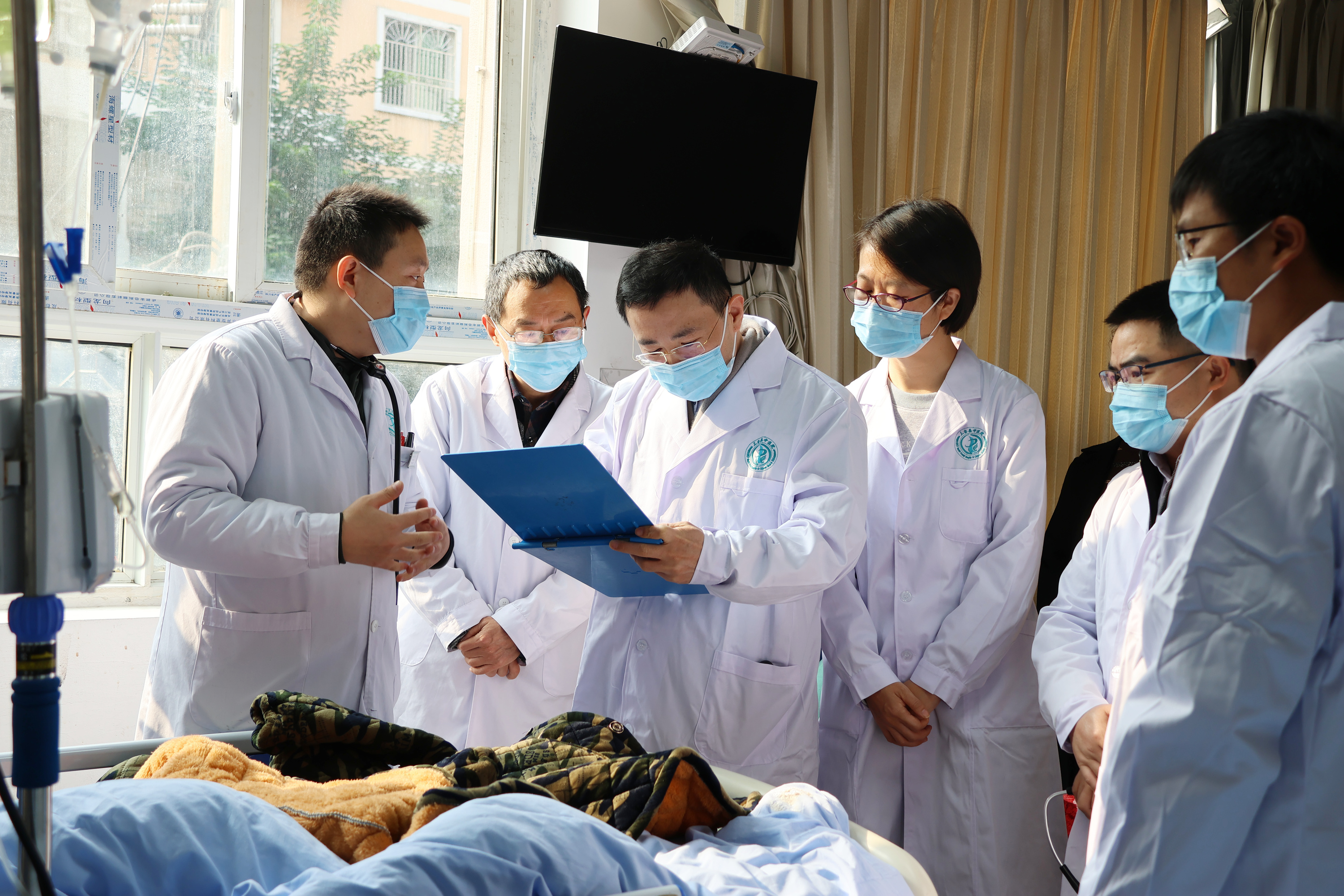 在教学查房中,王毅兴教授认真听取主管医生对患者的病情汇报,并现场结合切脉、望诊等方法进行辨证施治,同时针对患者目前最主要的症状给予了专业的干预治疗。