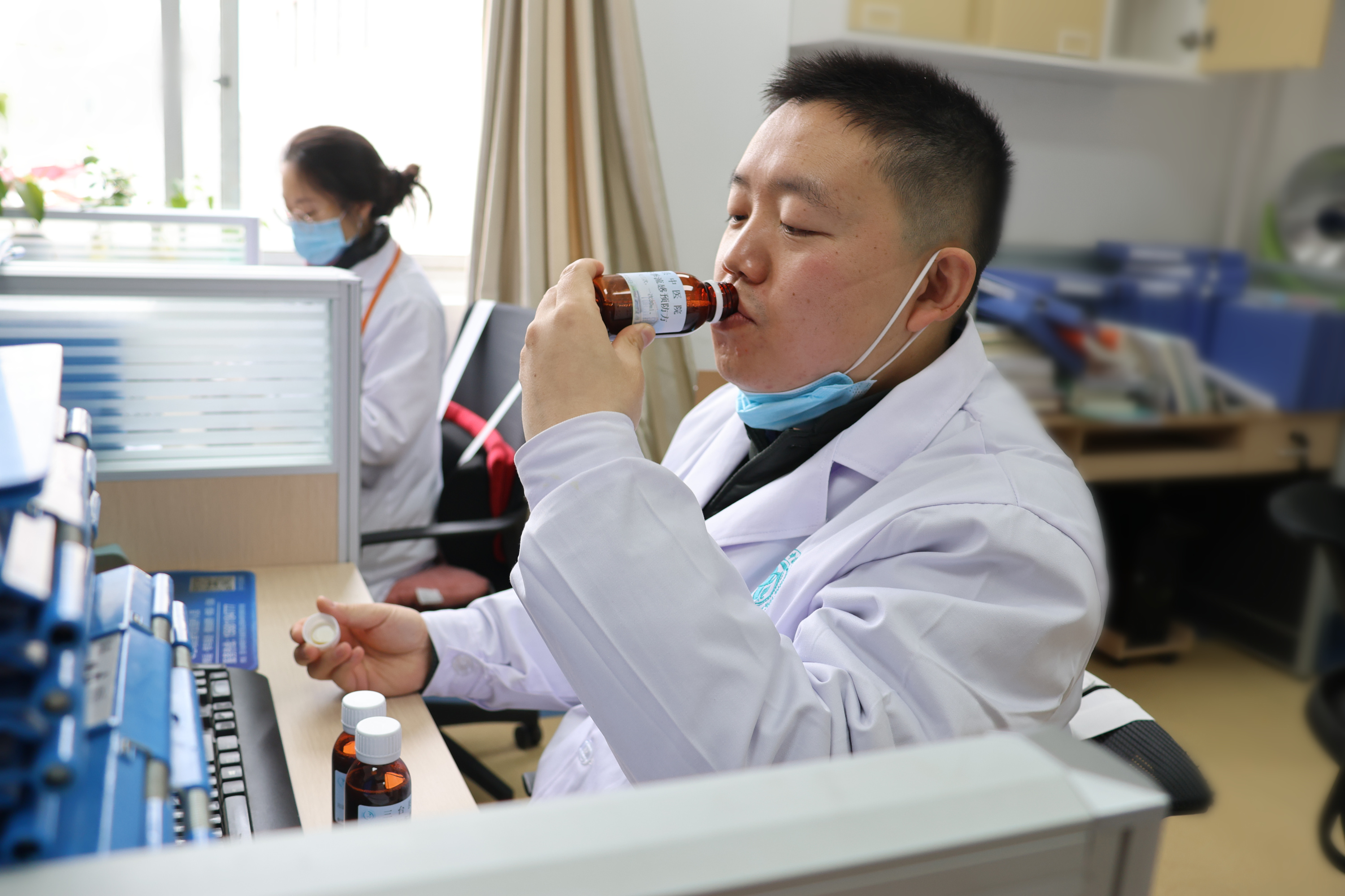 “一天一瓶,一次喝三分之一,大家趁热喝,一定要多注意保护自己。”在各病区里,门诊党支部党员干部们详细地为医务人员讲解预防汤剂的饮用方法。