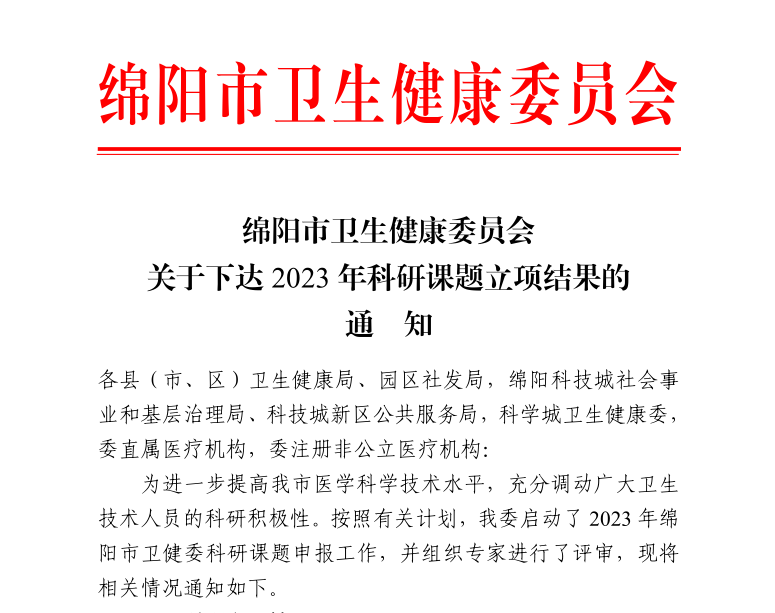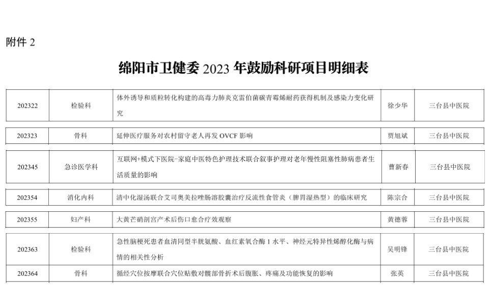 近日,绵阳市卫生健康委员会发布《关于2023年绵阳市卫生健康委科研课题立项项目的公示》,三台县中医院7个科研项目名列其中。