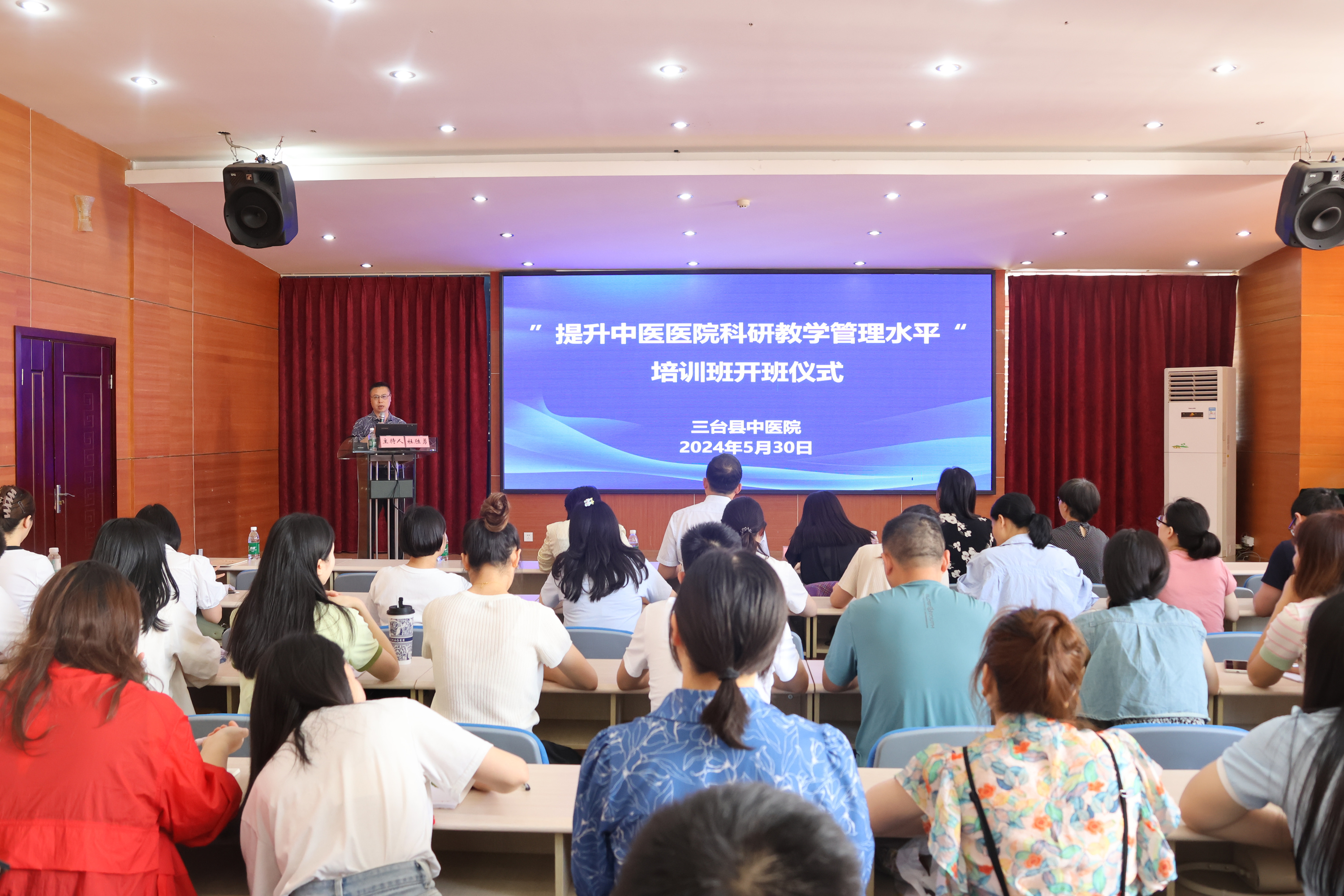 5月30日,三台县中医院与四川中医药高等专科学校共同举办的“提升中医医院科研教学管理水平培训班”正式开班,四川中医药高等专科学校党委委员、党委组织部部长尚宁川,继续教育学院副院长赵玲,临床医学院副院长赵英颖,教务处处长曹艳霞出席开班仪式,三台县中医院党委书记应军、副院长杜胜勇及各科室教研秘书、带教老师参加。