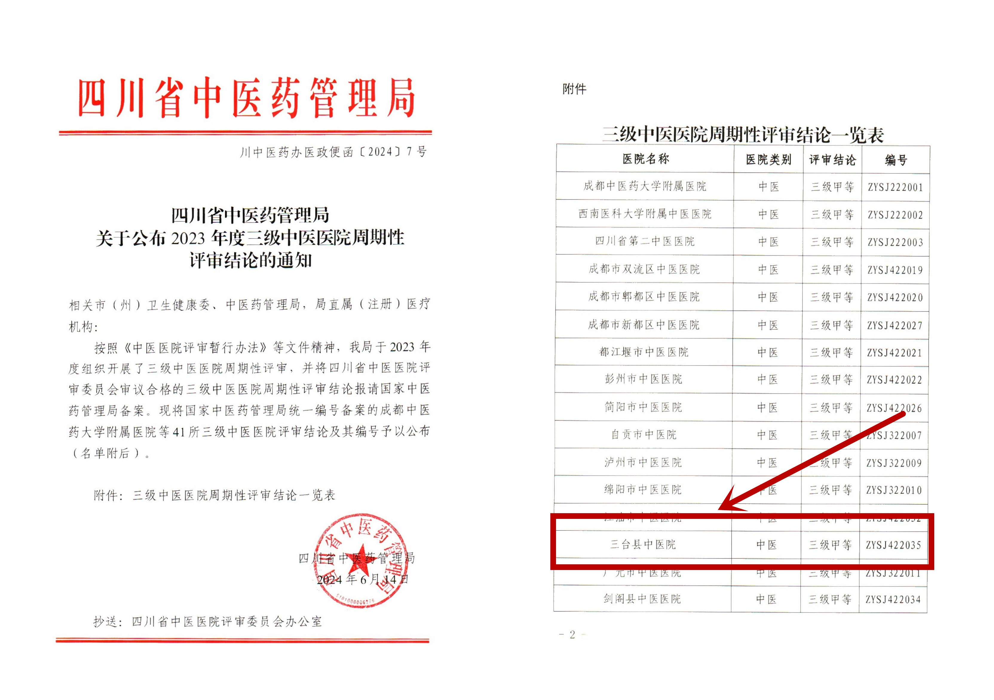 近日,四川省中医药管理局公布《2023年度三级中医医院周期性评审结论的通知》,三台县中医院顺利通过四川省三级甲等中医医院周期性评审,标志着我院在公立医院高质量发展迈上了新台阶和新征程。