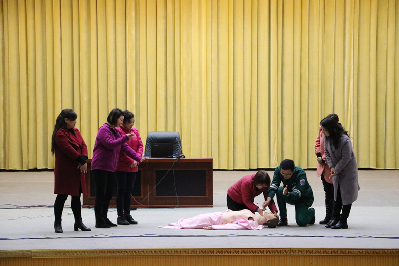 讲座现场,高兴松副主任医师讲解了中医养生保健知识,以及如何科学饮食,合理用药等注意事项;急诊科副主任骆雨就徒手心肺复苏急救方法进行讲解和示范,现场指导学员们实际操作。