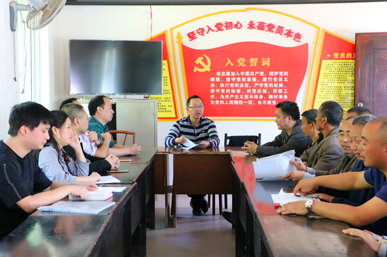 在枫垭村村委会,召开三台县中医院、枫垭村联合党支部“不忘初心、牢记使命”主题教育专题会,谭建军书记组织学习开展主题教育相关文件,并以“牢记初心使命,助力脱贫攻坚”为题讲党课。随后,联合党支部座谈研究脱贫攻坚工作具体困难问题,商讨解决方案。