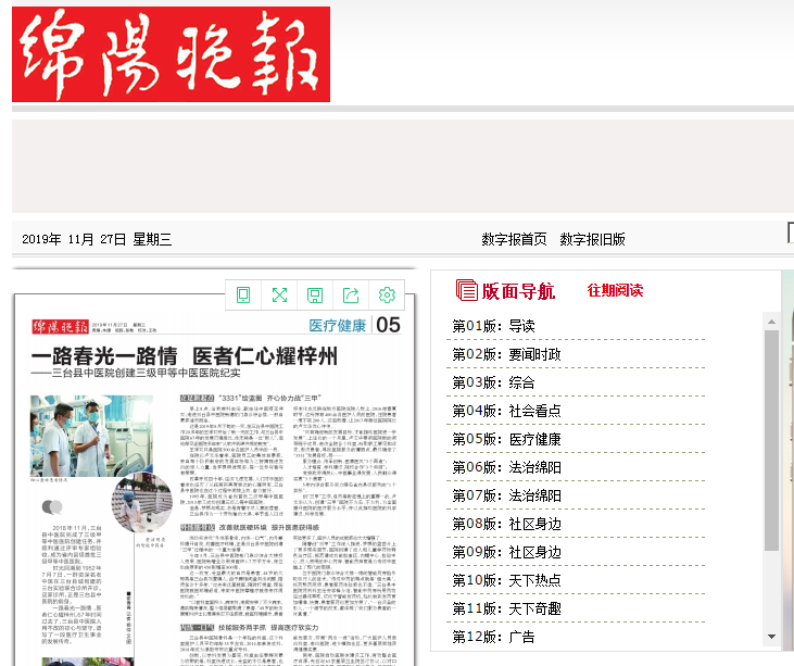 2018年11月,三台县中医院完成了三级甲等中医医院创建任务,并顺利通过评审专家组验收,成为省内县级首批三级甲等中医医院。