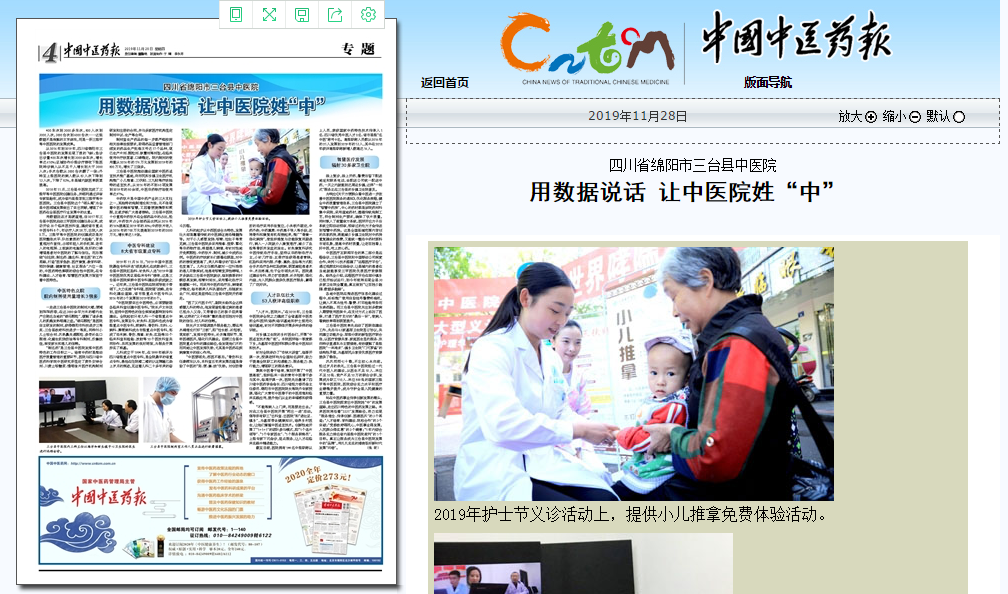 2018年11月,三台县中医院完成了三级甲等中医医院创建任务,并顺利通过评审专家组验收,成为省内县级首批三级甲等中医医院。三台县中医院这个“领头雁”为全县中医领域发展做出了突出贡献,增强了中医药在全县医疗行业发展中的比重。
