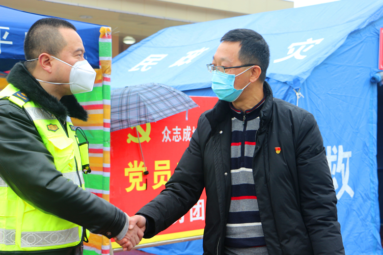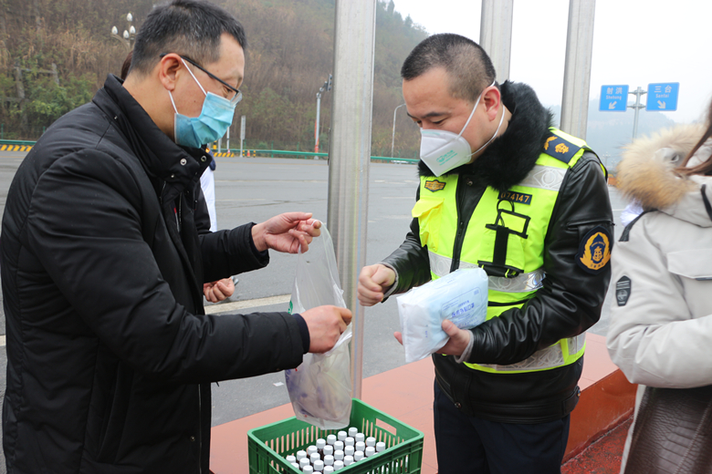 2月2日,院党委书记谭建军代表全体医护人员前往塔水桥高速路口,看望慰问奋战在抗击疫情一线的路政大队、交警等指战员,送去了一次性医用口罩、一次性医用手套和院内熬制的中药等防疫药用品等共计价值2000余元。