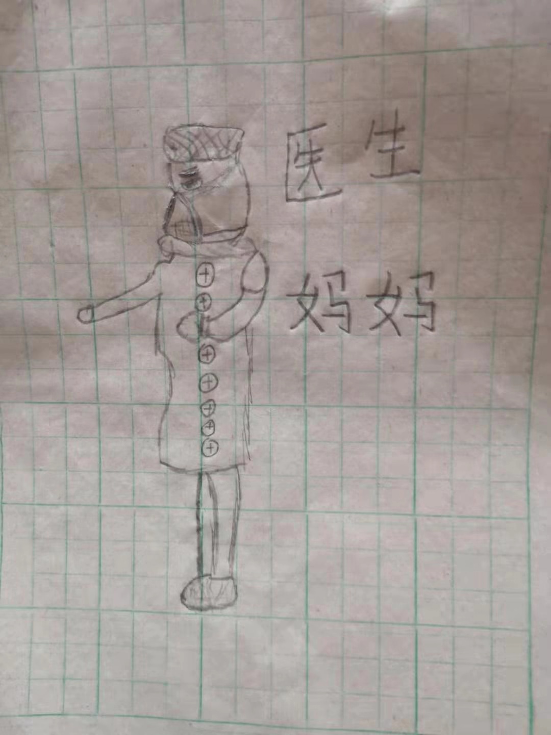 和众多的孩子一样,珮娃喜欢画画。“他对于护士和医生没有概念”外婆说,“此时此刻,他对妈妈的思念之情全部聚集于这张画上,等见到妈妈之后亲自送到妈妈手中。而我偷偷把这幅画拍成照片发给了李霞,李霞在电话那头就哭了起来。我就对她说,你做好防护工作,平安归来,这就是孩子最大的期盼!”