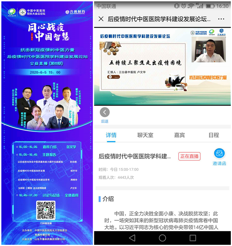 6月5日,由中国中医医院院长大会主办的同心战疫中国智慧--“抗击新冠疫情的中医力量”,在新媒体平台在线直播,对中医药抗疫经验等方面话题进行广泛交流和深入探讨,同步在线收看人次5000余人。