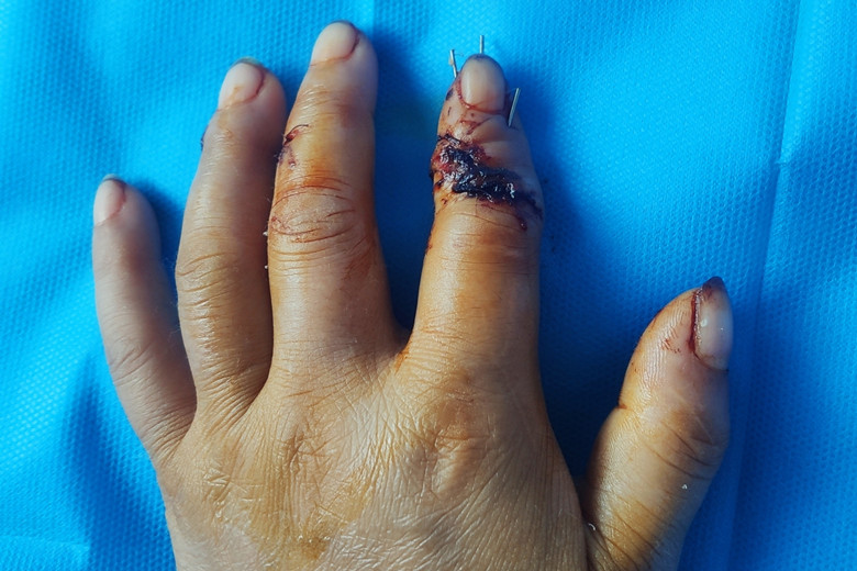 患者曾女士,因在三台某工地操作电锯时被锯伤左手,导致左手食指完全离断,左手拇指、中指、环指切割伤,伤后患者立即来我院就诊。经科室讨论后立即制定断指再植的手术方案。