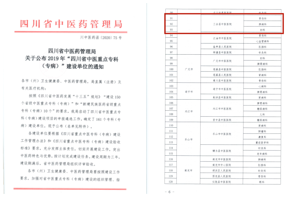 近日,四川省中医药管理局下发《关于公布2019年“四川省中医重点专科(专病)”建设单位的通知》川中医药函﹝2020﹞75号文件,遴选出省内161个专科(专病)建设单位,三台县中医院骨伤科、肺病科、妇科榜上有名。