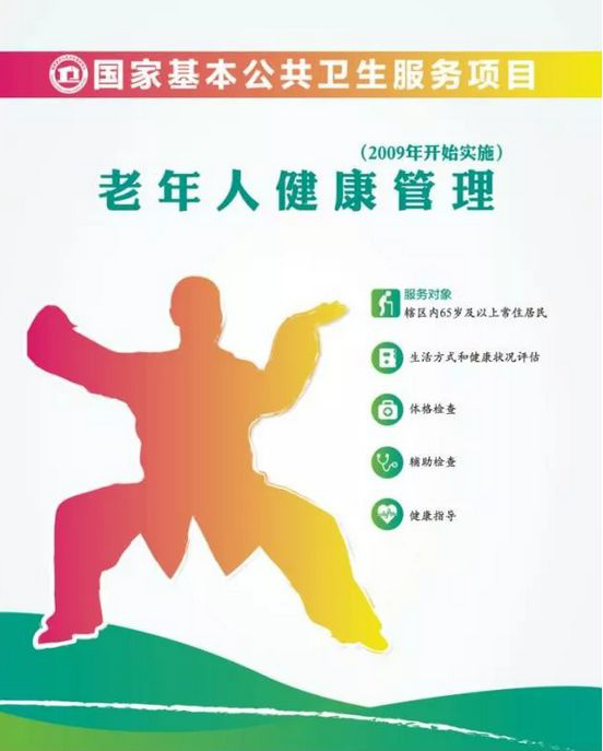 对辖区内65周岁及以上老年人进行登记管理,每年可以免费获得1次健康管理服务,包括生活方式和健康状况评估、体格检查、辅助检查和健康指导等。其中,辅助检查项目包括肝功能、肾功能、血脂、血常规、尿常规、空腹血糖、血脂、腹部B超(肝胆脾胰)、心电图检测等。