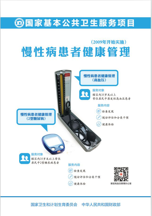对35岁及以上常住居民中的原发性患者高血压、2型糖尿病患者登记管理,每年对管理的慢性病人群进行1次免费健康体检和4次随访。免费体检内容包括脉搏、呼吸、血压、身高、体重等一般体格检查,及血糖、血常规、尿常规、肝功能、肾功能、血脂、心电图和腹部B超。随访主要包括一般身体检查、血糖血压检测、用药情况指导,生活方式评估和指导,必要时的转诊服务。在管理过程,医生会及时发现其他健康问题,及时调整治疗方案;当出现危急症状或存在不能处理的其他疾病时,医生会在处理后紧急转诊;降低患者及家属的精神压力,缓解因病情控制不理想而造成的经济压力。