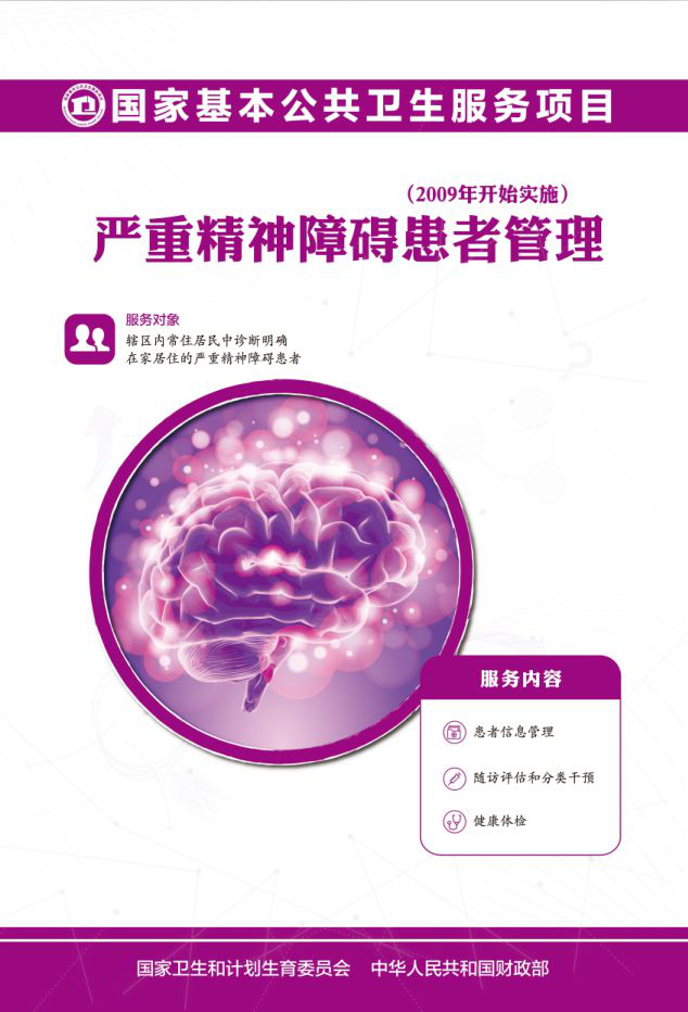 对辖区常住居民中诊断明确、在家居住的严重精神障碍患者进行登记管理;对应管理的严重精神障碍患者每年进行一次免费的健康体检,内容包括一般体格检查、血压、血糖、体重、血常规、转氨酶及心电图等检查;每年至少进行4次随访,每次随访对患者进行危险性评估,对患者及其家属进行有针对性的健康教育和康复指导。