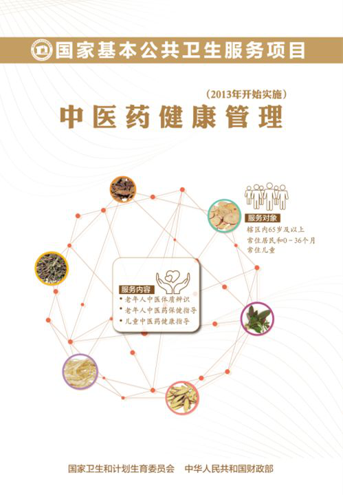 每年为65岁及以上老年人做1次中医体质辨识,根据不同体质进行个体化中医健康指导。中医药体质分为平和质、阳虚质、阴虚质、气虚质、痰湿质、湿热质、血瘀质、气郁质、特禀质9种类型。针对0~36个月儿童主要健康问题,在儿童6、12、18、24、30、36月龄时对儿童家长进行儿童中医药健康指导,具体包括饮食调养、起居活动指导,传授摩腹、捏脊、揉迎香穴、足三里穴、四神聪穴的方法。