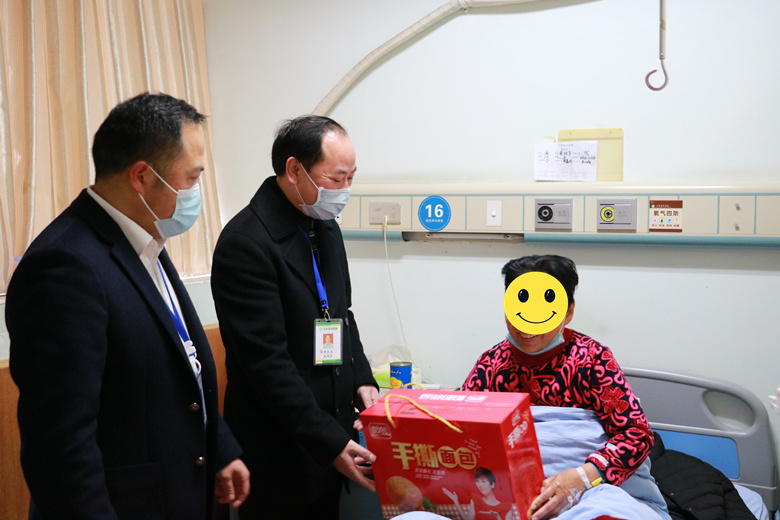患者们都握住医院领导的手连声致谢:“住院期间受到了医护人员细心的照顾,没想到春节还能收到医院送来的礼品,太暖心了。”