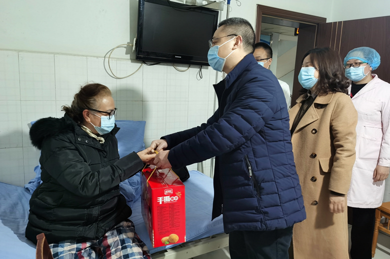 2月12日,大年初一,党委书记谭建军带领医院领导班子深入病区,为患者送上节日礼物及新春祝福。