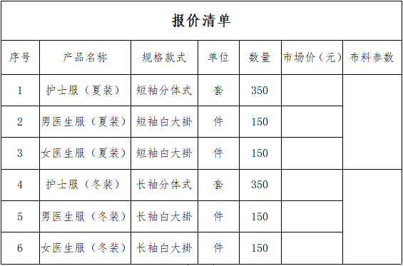 三台县中医院拟采购医生、护士工作服一批,现就此开展市场调查及询价。采购人将根据调查结果制定招标参数及招标限价。