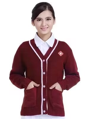 3.款式:衣服只带加羊毛绒、单排扣、V领开衫长袖外套,两个大口袋,弹力螺纹袖口锁边,毛衣设计风格简单大方,适合护理使用,突显其端正大方。
