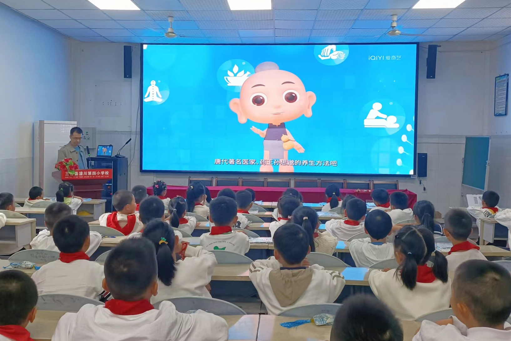 现场还为同学们播放中医药卡通形象“灸童”与“药王”孙思邈对话的主题视频,带领大家一边观看视频一边学习孙思邈“养生十三法”。