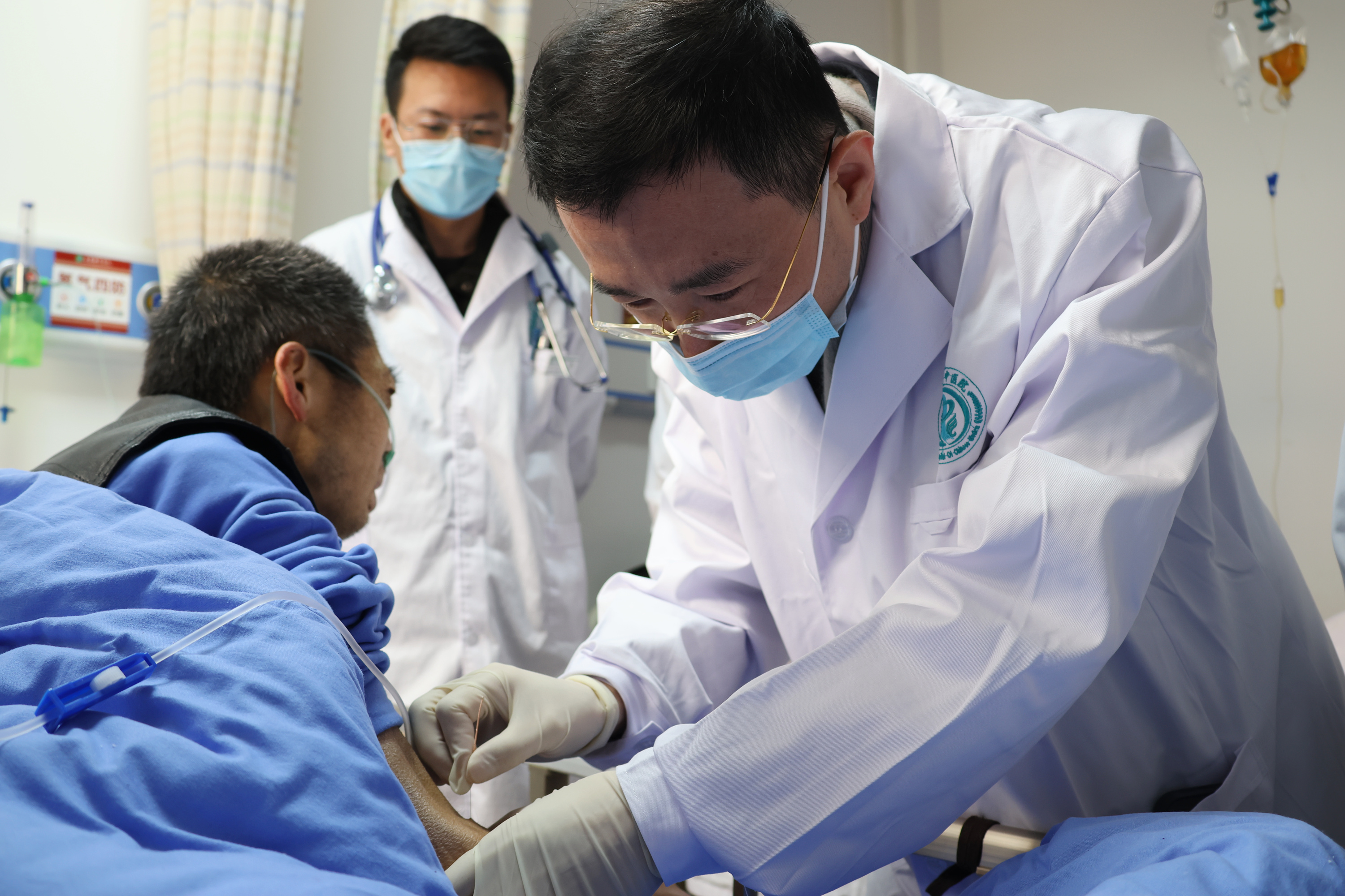 老年病科的廖大爷今年52岁,平日里饱受慢阻肺、心衰、肺结核等多种疾病的折磨,长期呼吸困难,连最平常的平卧也无法做到。针对此症状,王教授对其采用了针刺神经调控技术,血氧饱和度随即便恢复至正常,效果立杆见影,不一会儿患者便能平卧呼吸。