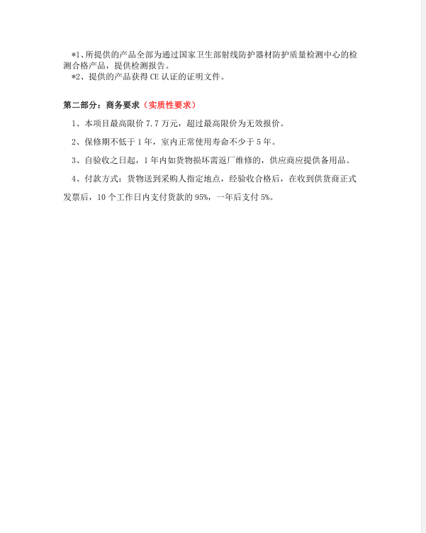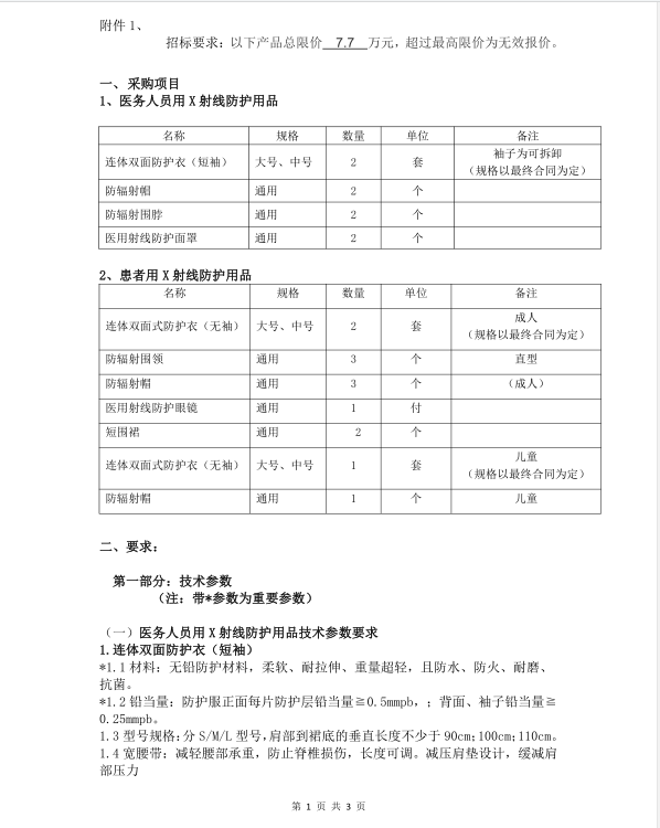 三台县中医院拟采用竞争性磋商方式购置一批X射线防护用品(具体要求详见附件),请有意合作的公司于2020年4月2日12:00前电话报名,报名后请于2020年4月2日下午2:40带齐下列资料(资料请准备三套)到行政楼三楼会议室参加磋商。资料包括:公司资质、代理人授权委托书、磋商文件要求的所有资料、报价(包括分项报价和总价)及其他应准备的资料。
