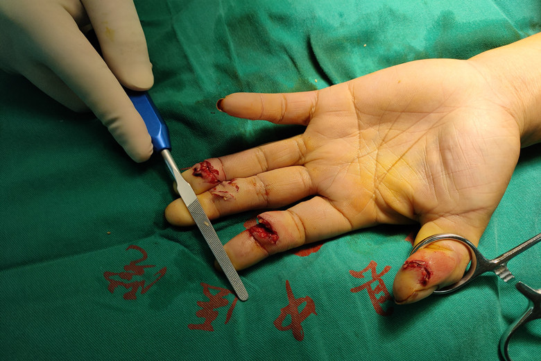 患者曾女士,因在三台某工地操作电锯时被锯伤左手,导致左手食指完全离断,左手拇指、中指、环指切割伤,伤后患者立即来我院就诊。经科室讨论后立即制定断指再植的手术方案。
