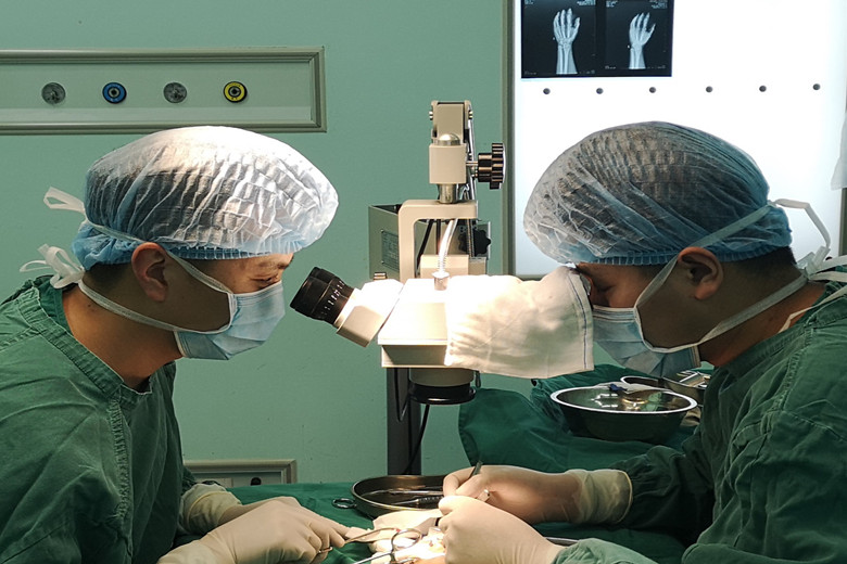 据骨伤科医生魏巍介绍,断指再植手术的关键在于血管的吻合,手指末节血管的直径只有约0.3-0.5mm,医生所用的显微缝合线如头发直径的1/2,肉眼很难看清,手术必须借助显微镜来吻合静脉、动脉。为满足群众需求,我院启动了显微外科新技术,投资购买了先进的手术显微镜、显微器械,为成功开展这类手术创造了必备的条件。