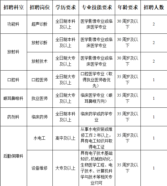 因医院科室业务发展需要,现急需招聘以下岗位工作人员。
