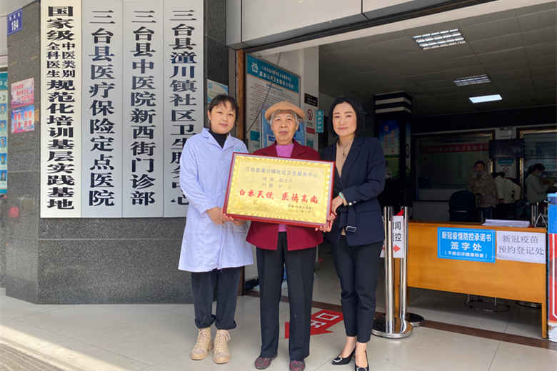 4月12日,家住草堂社区的杨阿姨将精心制做的匾额送到三台县中医院潼川社区卫生服务中心工作人员的手中,她说,“社区卫生服务中心一直以来对我们的关心照顾无微不至,不是亲人胜似亲人,我们的感激之情无以言表,一面小小的匾额是全家人的心意。”