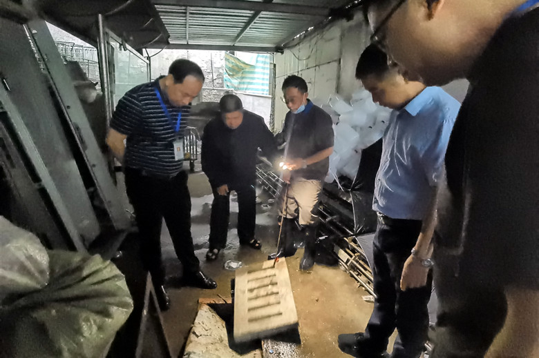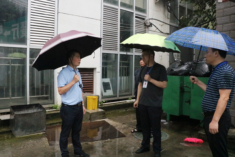 院督查组冒雨先后查看了排水管网、库房、配电室等院内防汛重点部位,听取相关负责人对院内各处防洪排水的主要措施及应急处理方案的汇报。