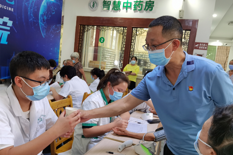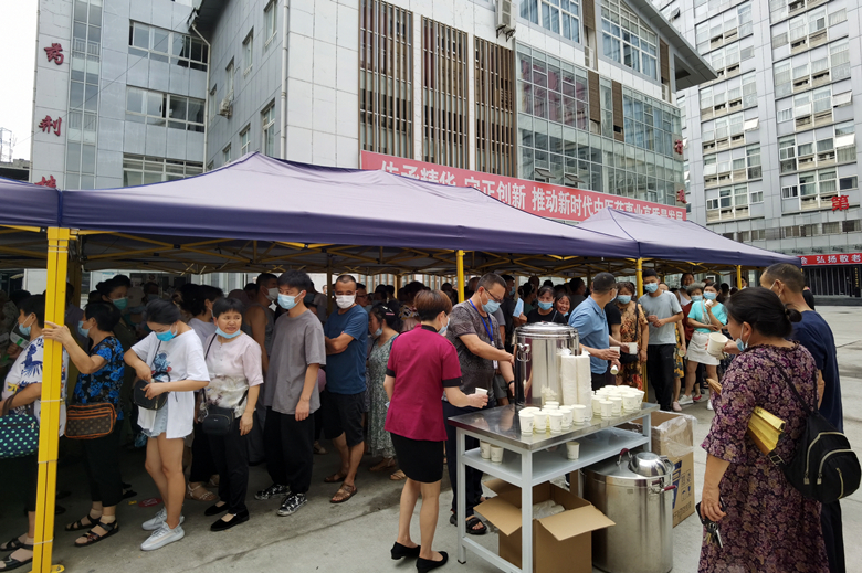 7月26日,三台县中医院为新冠疫苗接种点的群众免费发放清暑中药汤剂。