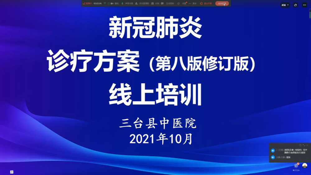 当天下午,三台县中医院还组织全院职工开展了新冠肺炎诊疗方案(第八版修订版)及新冠肺炎防控方案(第八版)线上培训,进一步加强了我院医护人员对新型冠状病毒感染的肺炎诊疗方案和感染防控的认识,提高了新冠肺炎医疗救治工作水平。